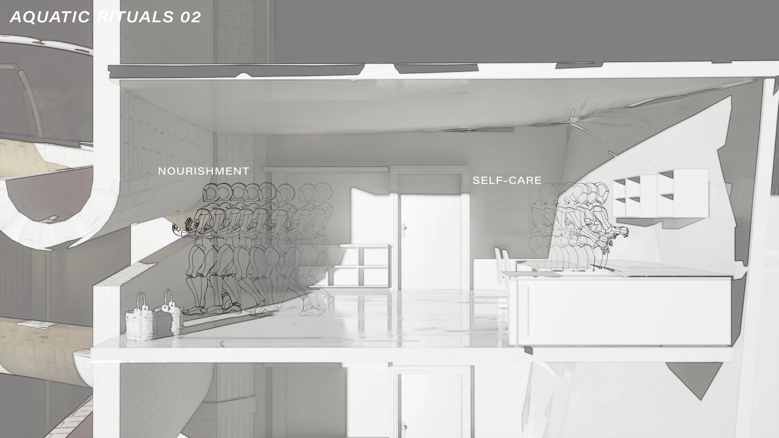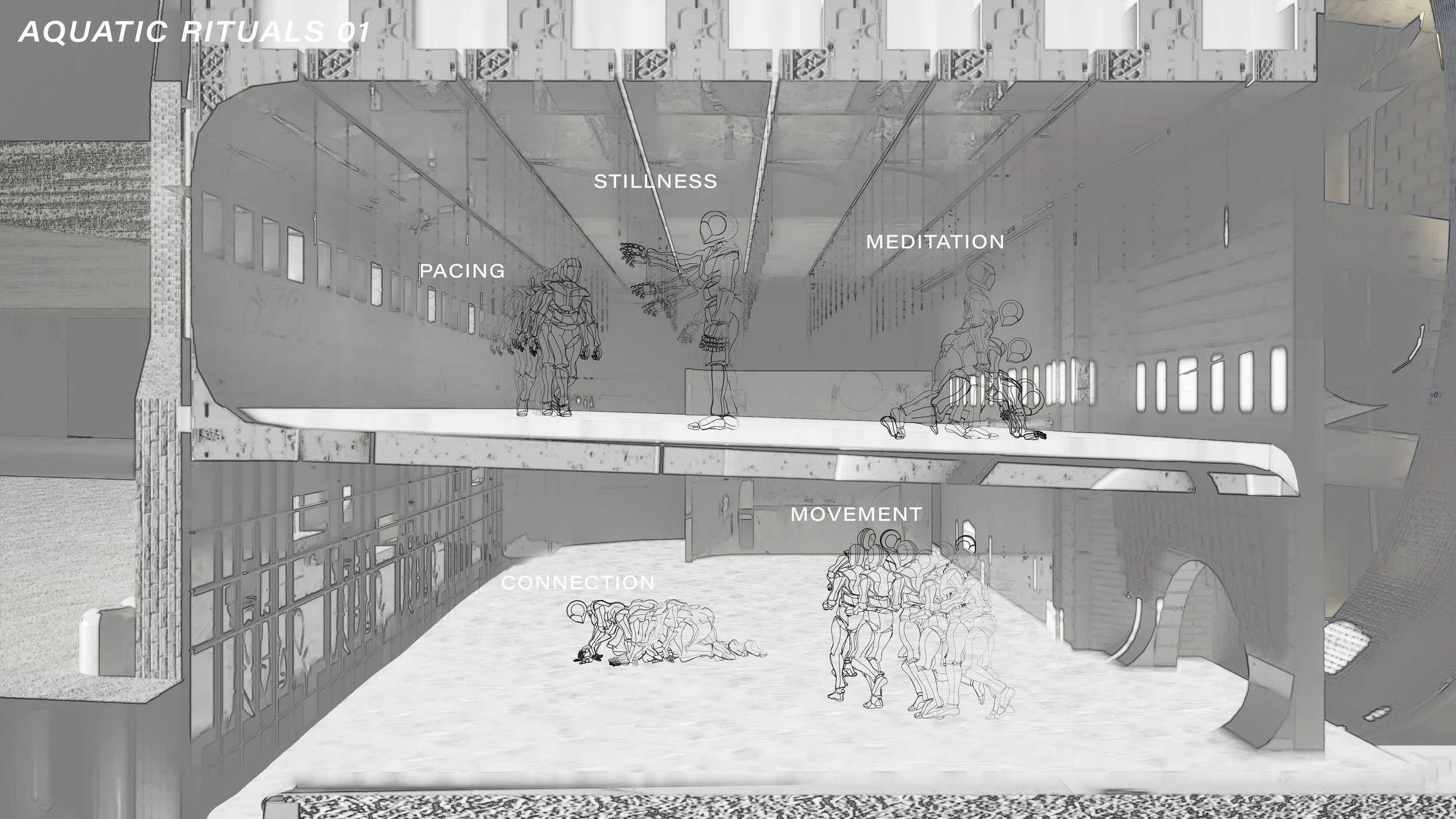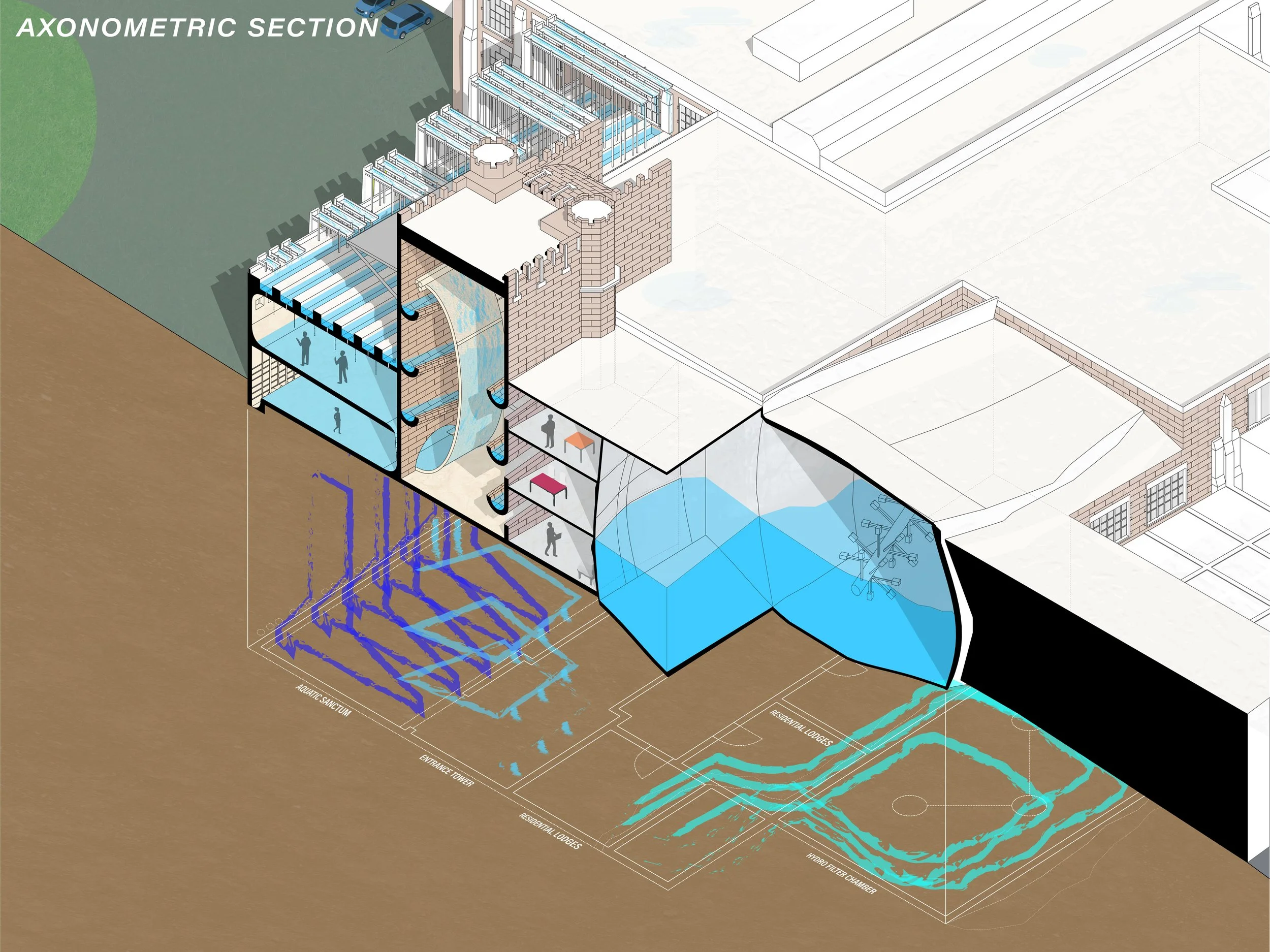 This project explores how architecture can capture the boundless qualities of water through spatial integration within a reimagined water treatment facility in Knoxville, Tennessee. Drawing on gravity-based systems, exaggerated water movements, and antique transport methods, the design emphasizes seamless transitions and warped architectural forms that shape ritualistic experiences. Set at the historic Mark B. Whitaker Water Treatment Plant along the Tennessee River, the project responds to the site’s Tudor-style architecture and filtration systems, intertwining water and built form in meaningful ways. Spatial episodes—such as cascading scaffolds evoking waterfalls, a semi-flooded “aquatic sanctum” for interactive ritual, and warped brickwork channeling water through gravity—invite visitors to reflect, meditate, and engage with water as both infrastructure and experience. By transforming the treatment plant into a visible, interactive, and tranquil environment, the design reframes water not only as utility but as a dynamic presence that enhances daily life and fosters deeper human connection.