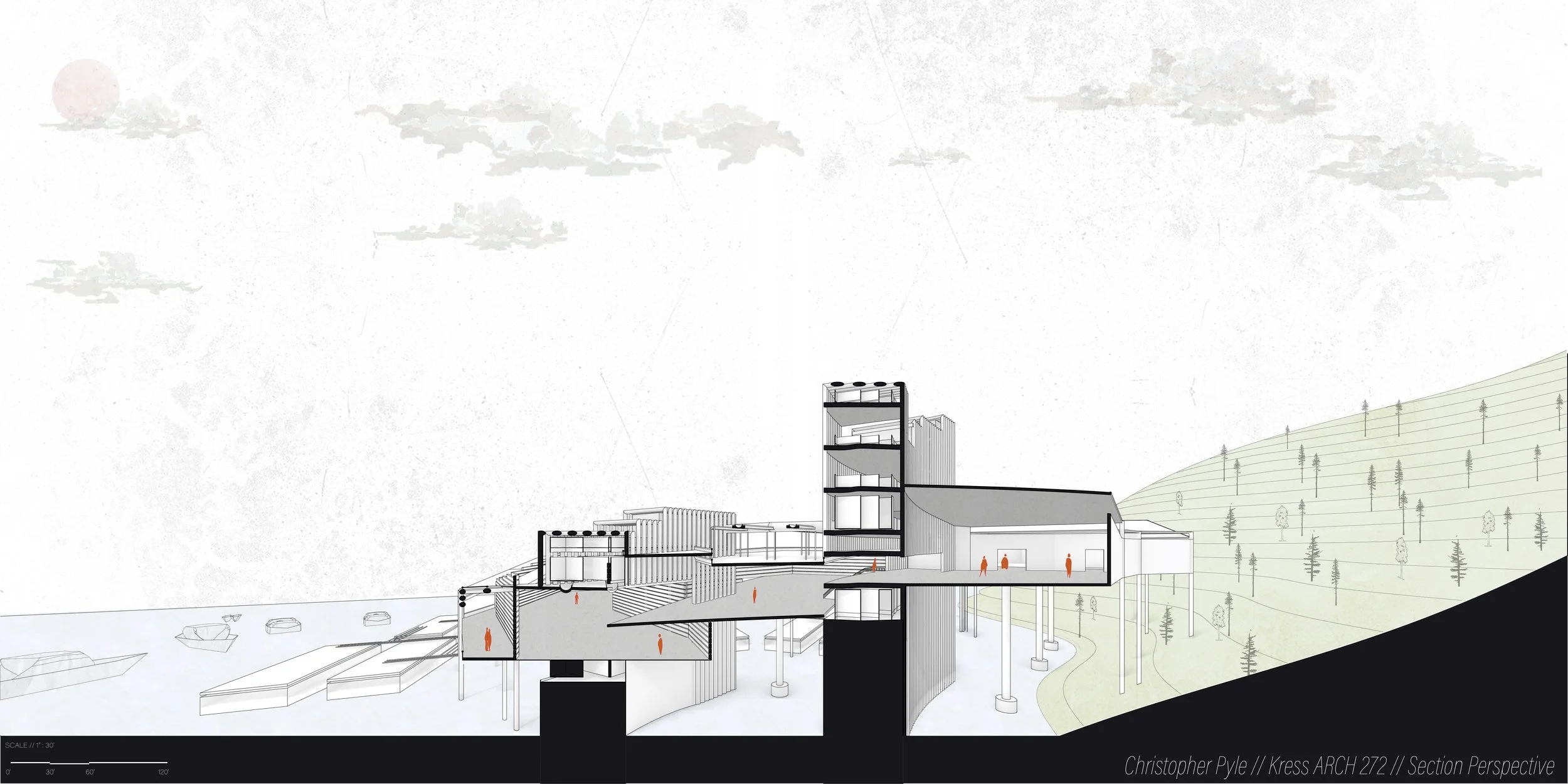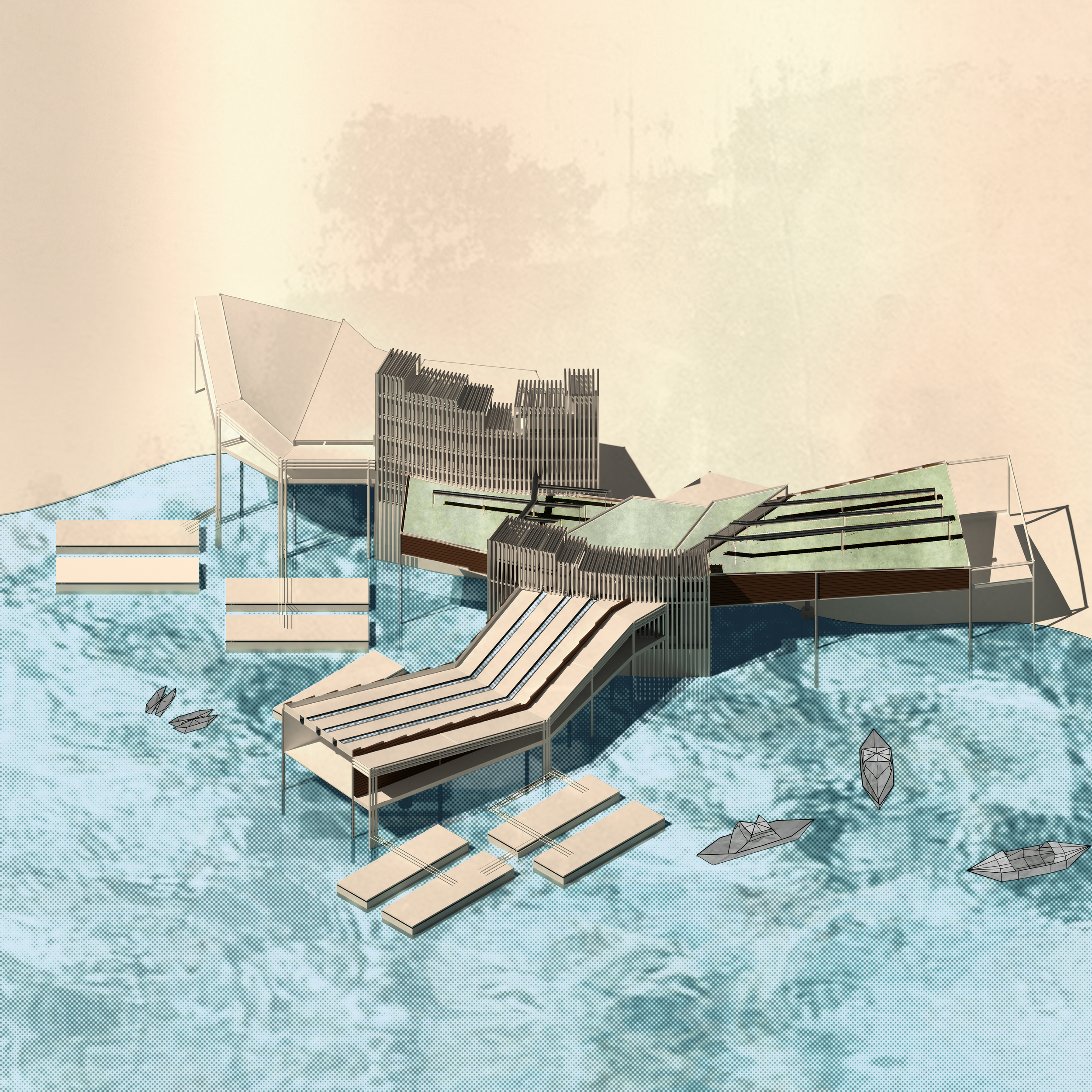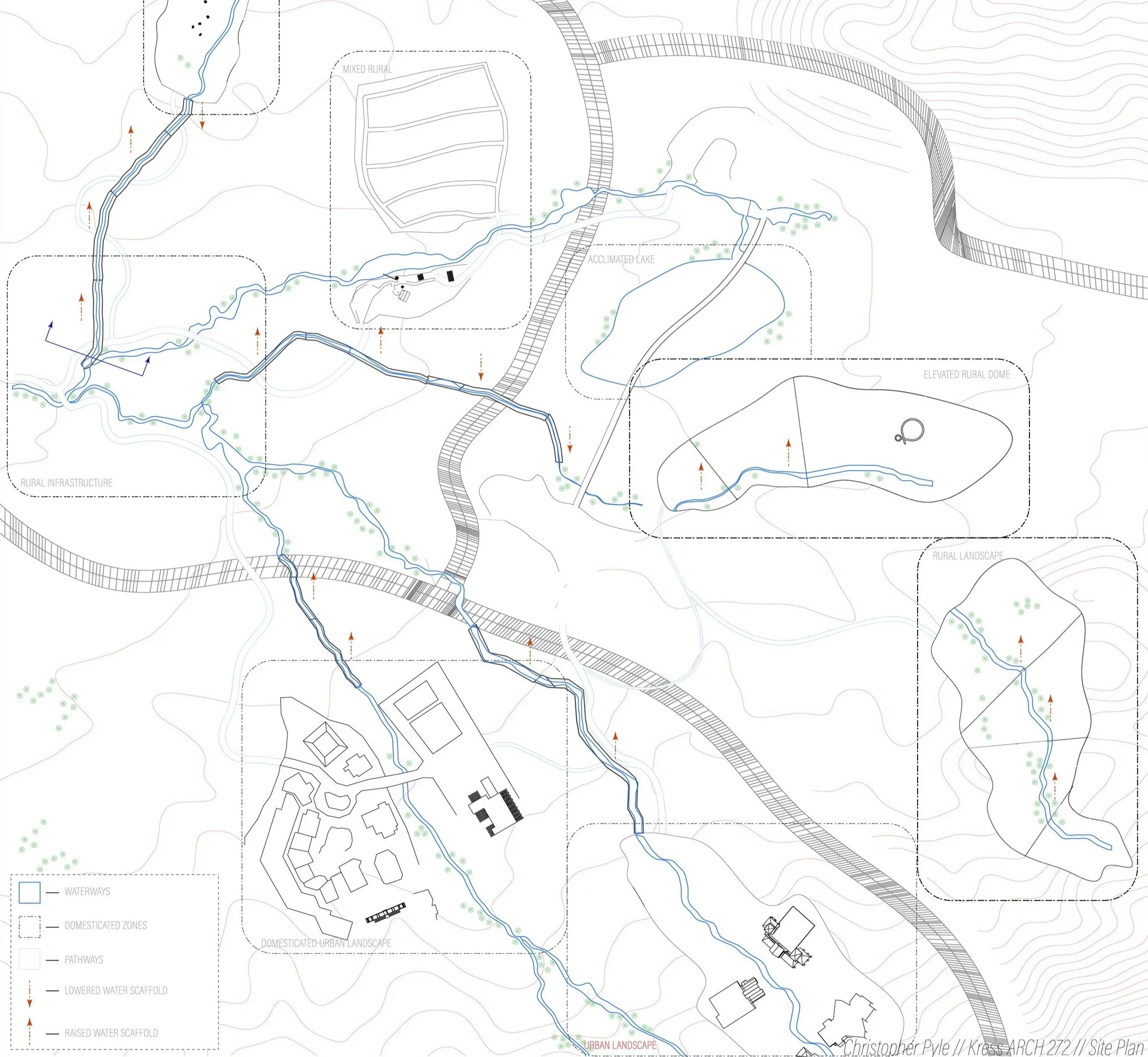 Reimagining the Great Smoky Mountains along the Cades Cove River System, the design integrates human and water pathways to respond to shifting ecosystems. It establishes distinct zones and a cyclical aquaculture system that supports a self-sustaining environment centered on water and its role in sustaining life. Spatial organization combines structures, green spaces, and elevated pathways to create a cohesive system balancing built and natural environments, while scaffolded waterways and terraced aquaculture manage water flow and support diverse aquatic habitats. Sustainable, permeable materials ensure accessibility with minimal environmental impact, and the arrangement fosters ecological resilience while offering opportunities for education and engagement. By harmonizing architecture and ecology, the design demonstrates how built form can interact with natural systems.