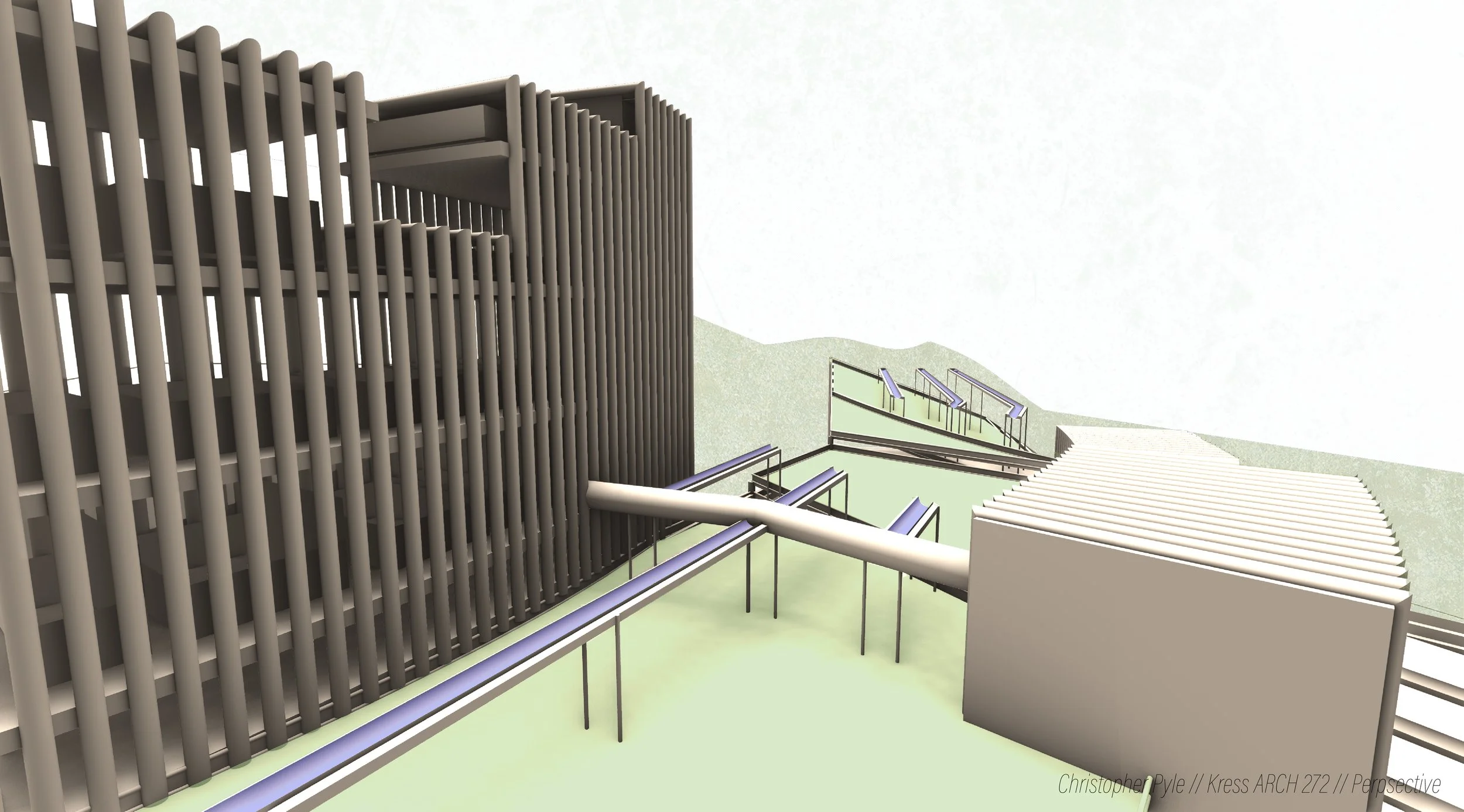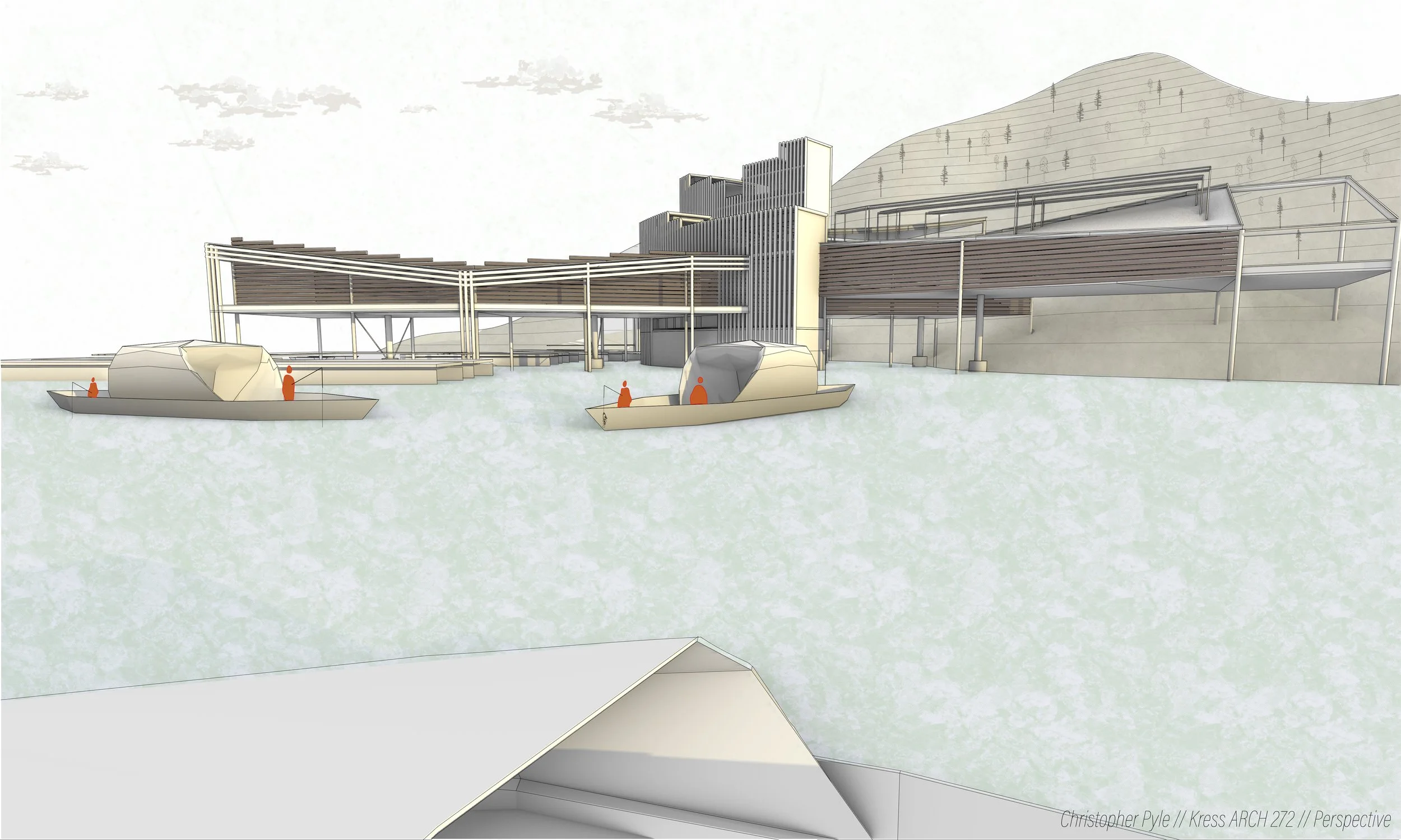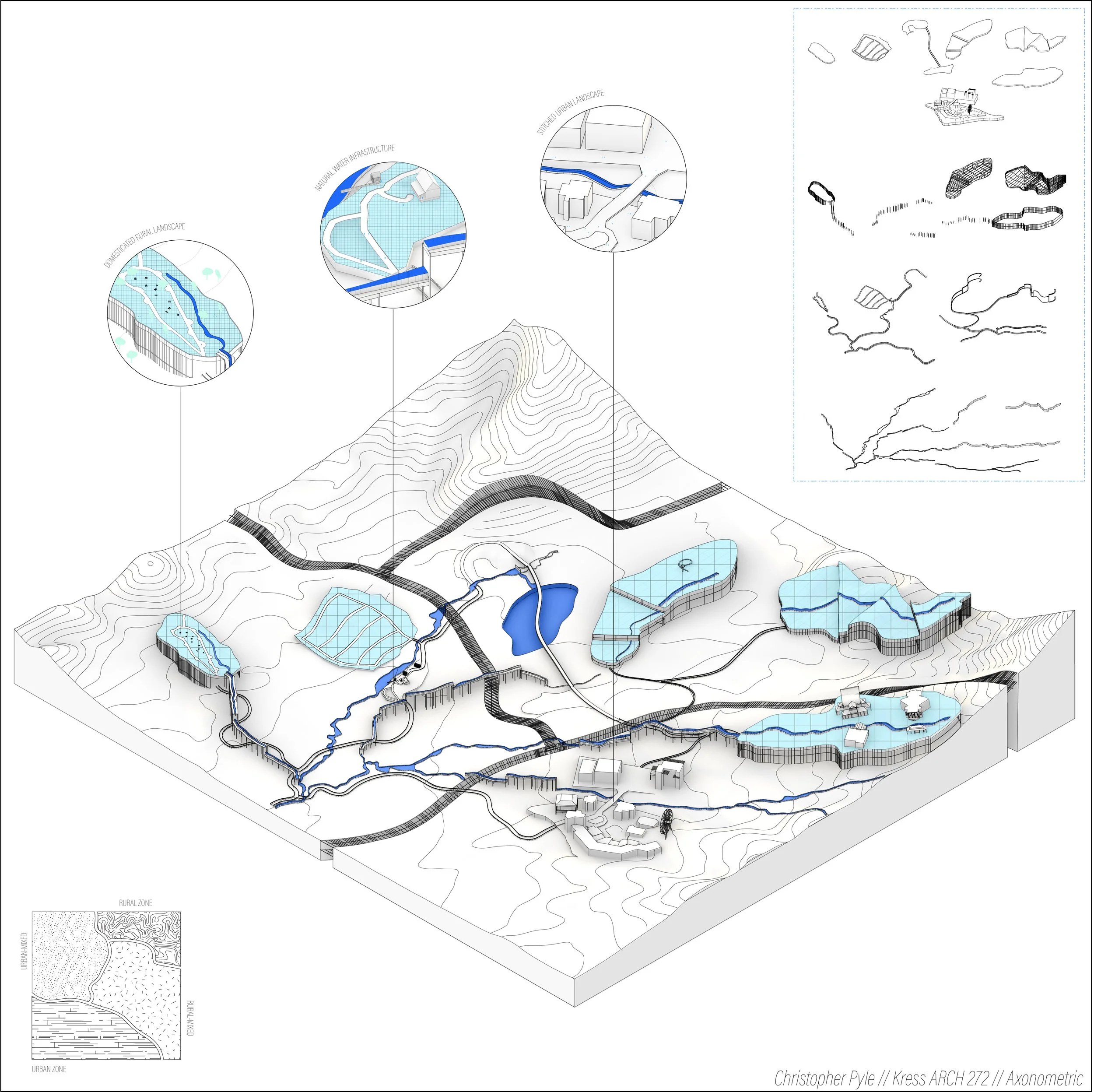Reimagining the Great Smoky Mountains along the Cades Cove River System, the design integrates human and water pathways to respond to shifting ecosystems. It establishes distinct zones and a cyclical aquaculture system that supports a self-sustaining environment centered on water and its role in sustaining life. Spatial organization combines structures, green spaces, and elevated pathways to create a cohesive system balancing built and natural environments, while scaffolded waterways and terraced aquaculture manage water flow and support diverse aquatic habitats. Sustainable, permeable materials ensure accessibility with minimal environmental impact, and the arrangement fosters ecological resilience while offering opportunities for education and engagement. By harmonizing architecture and ecology, the design demonstrates how built form can interact with natural systems.
