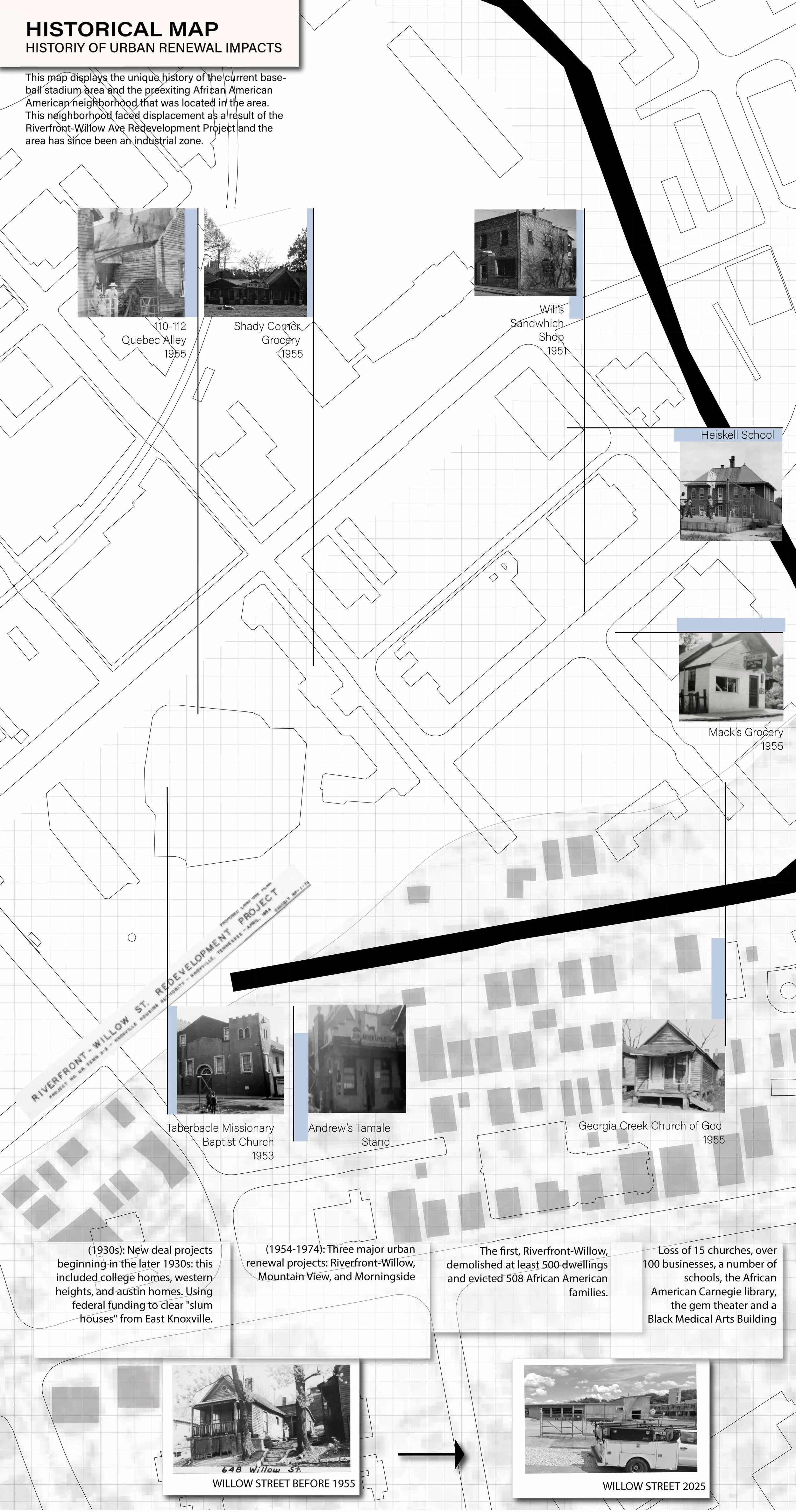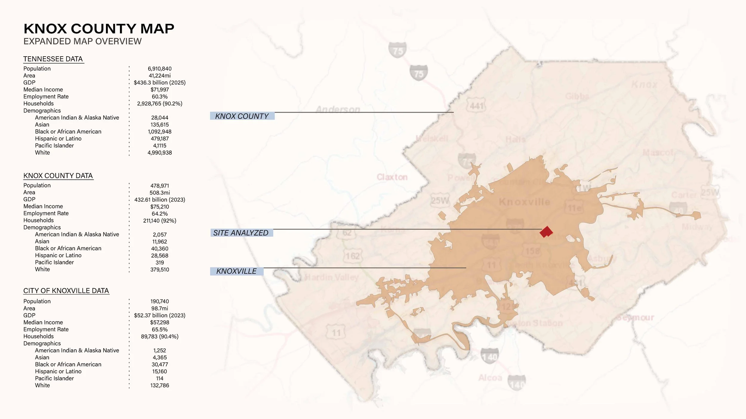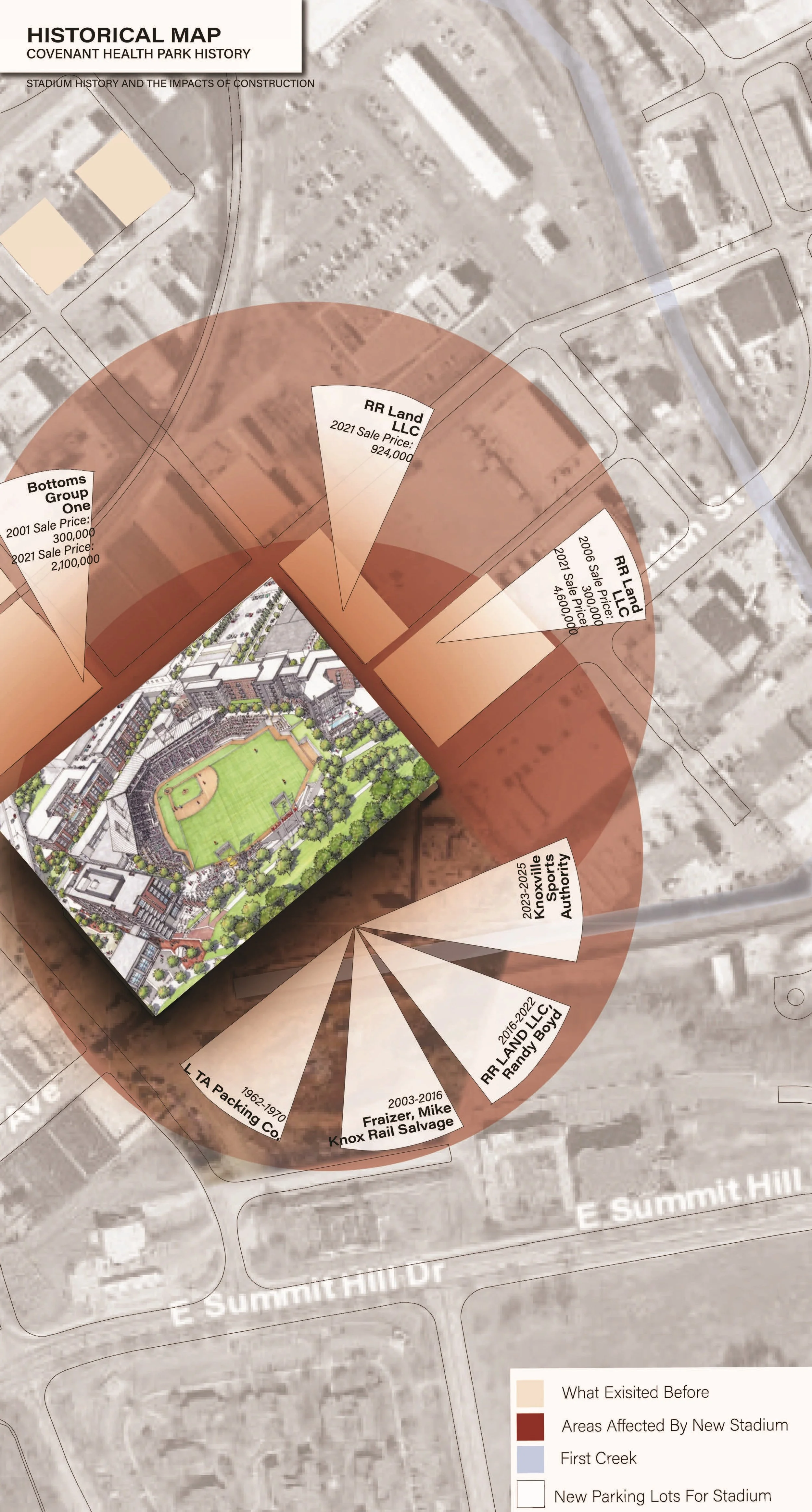 Located adjacent to the newly constructed Knox Baseball Stadium in East Knoxville, this site lies within primarily industrial and mixed-use zoning and is defined by a high proportion of private and vacant lots—approximately 22–31% of the area, including the stadium footprint—creating a sense of disconnection from surrounding neighborhoods. The analysis identifies opportunities to activate underutilized parcels and enhance connectivity, addressing challenges such as dilapidated sidewalks, limited bike infrastructure, and hard urban edges formed by the railroad, First Creek, Hall of Fame, and Summit Hill Drive. Three prime lots were highlighted for potential architectural intervention, capable of accommodating residential, commercial, and civic programs while integrating with stadium activity. The study also examines the influence of property ownership and appraisal changes on development potential, exploring how open, accessible spaces and strategic commercial programs can draw people into this currently isolated cul-de-sac. This analysis serves as a precedent study for future architectural development aimed at fostering a more connected, vibrant, and resilient urban district.