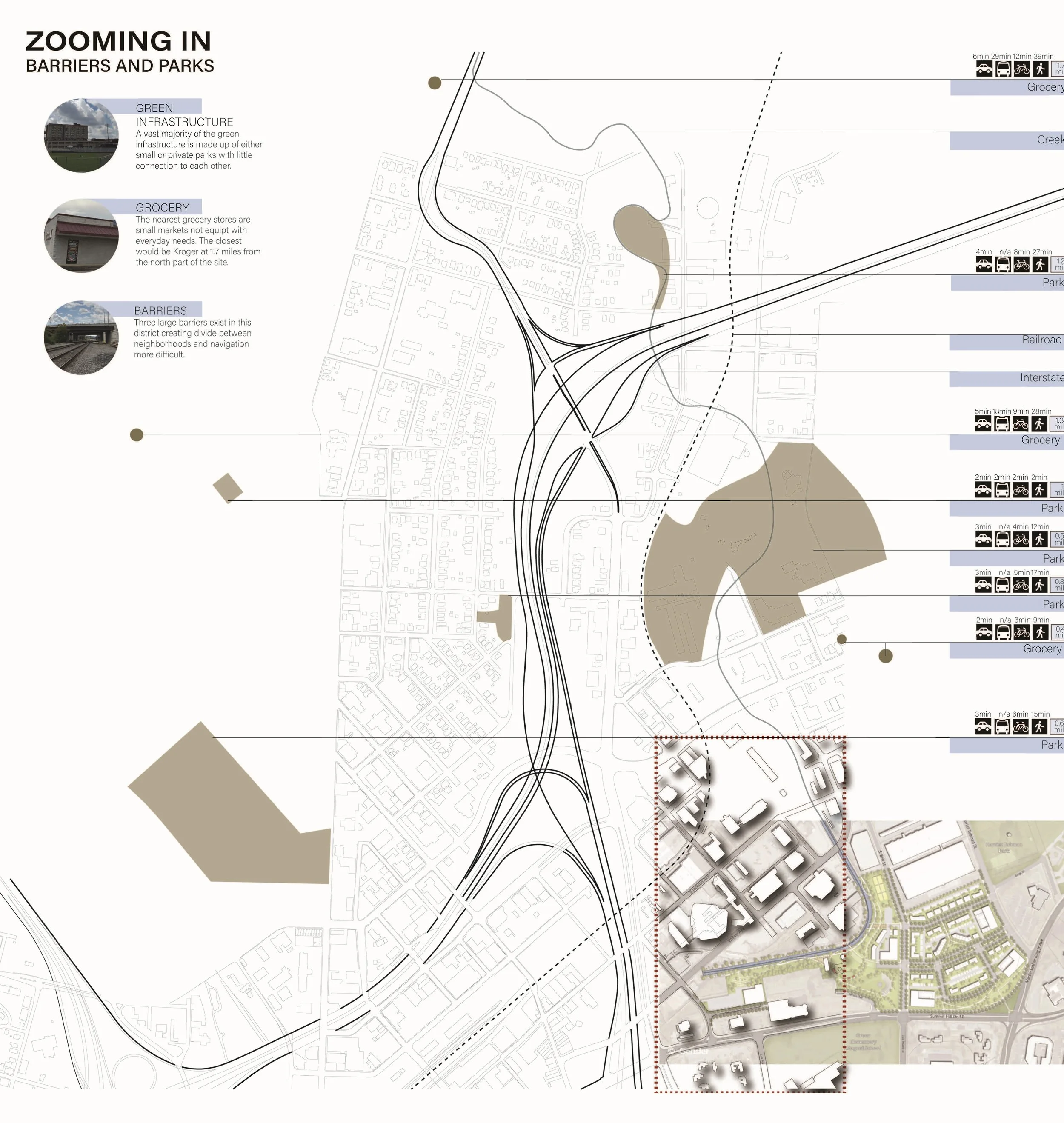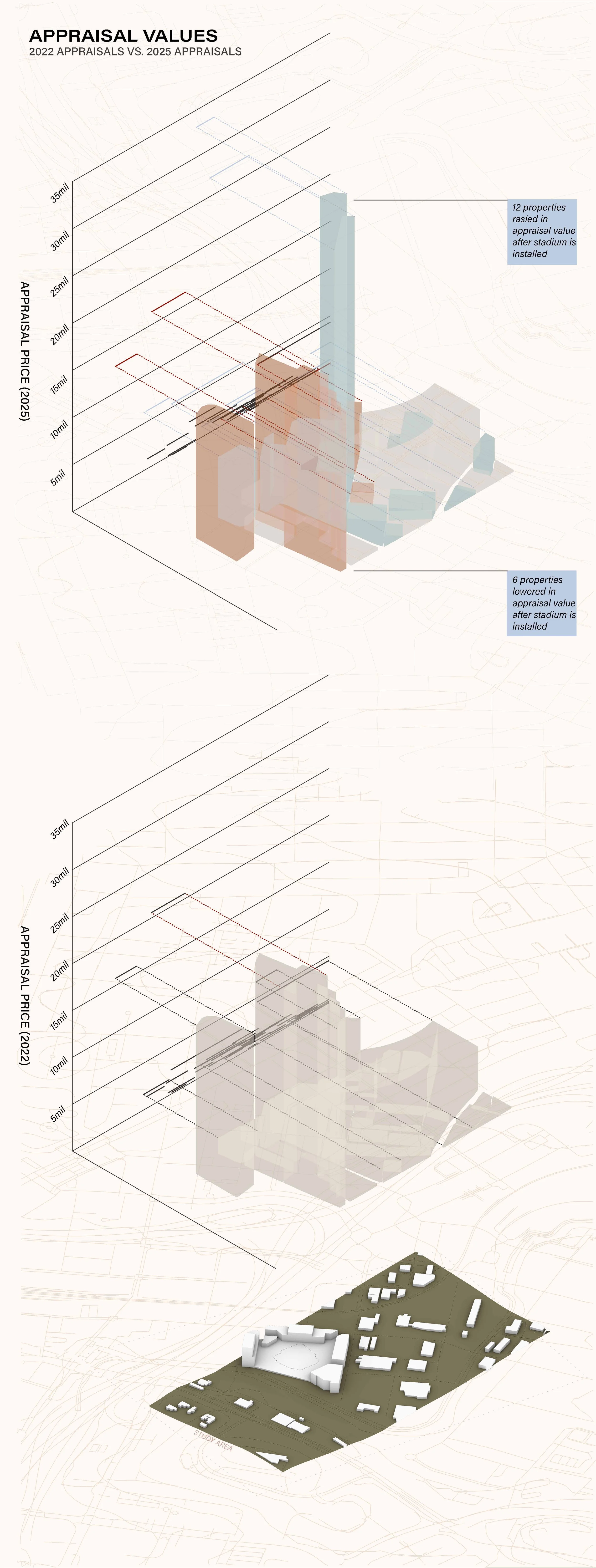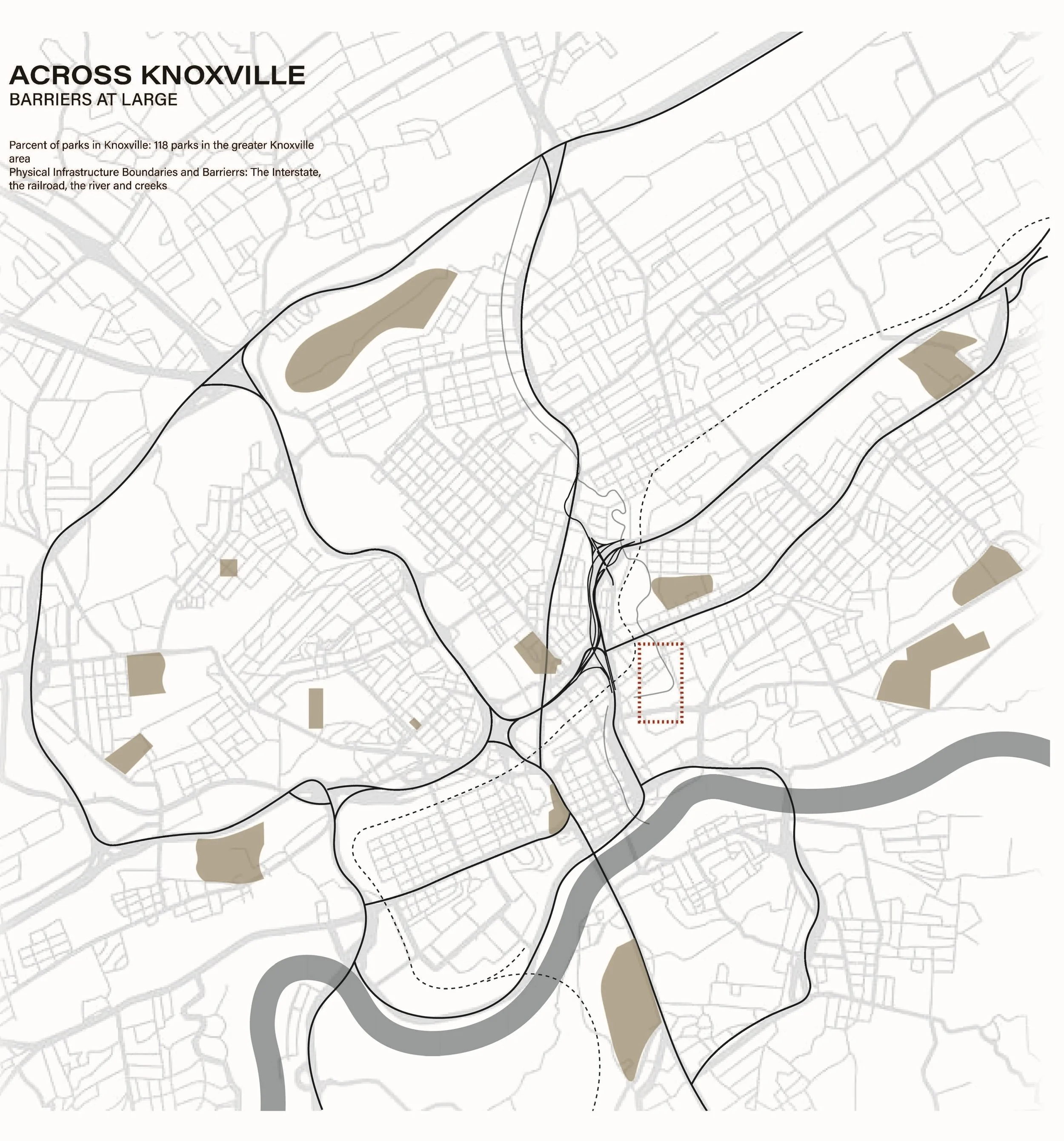 Located adjacent to the newly constructed Knox Baseball Stadium in East Knoxville, this site lies within primarily industrial and mixed-use zoning and is defined by a high proportion of private and vacant lots—approximately 22–31% of the area, including the stadium footprint—creating a sense of disconnection from surrounding neighborhoods. The analysis identifies opportunities to activate underutilized parcels and enhance connectivity, addressing challenges such as dilapidated sidewalks, limited bike infrastructure, and hard urban edges formed by the railroad, First Creek, Hall of Fame, and Summit Hill Drive. Three prime lots were highlighted for potential architectural intervention, capable of accommodating residential, commercial, and civic programs while integrating with stadium activity. The study also examines the influence of property ownership and appraisal changes on development potential, exploring how open, accessible spaces and strategic commercial programs can draw people into this currently isolated cul-de-sac. This analysis serves as a precedent study for future architectural development aimed at fostering a more connected, vibrant, and resilient urban district.