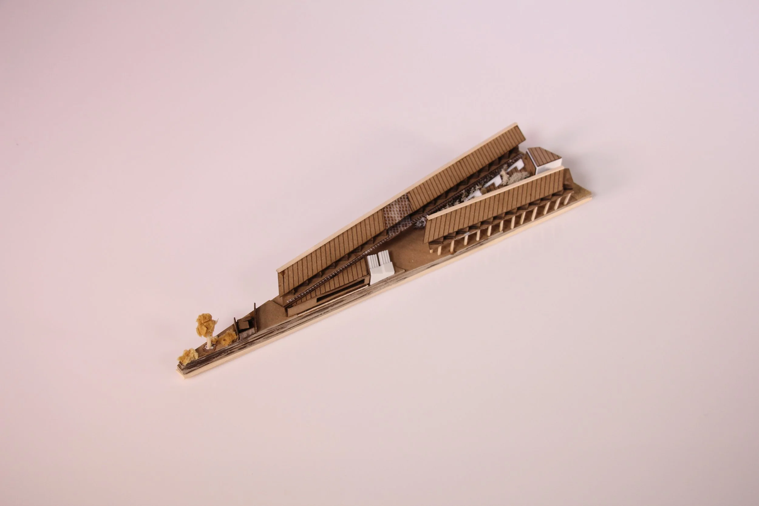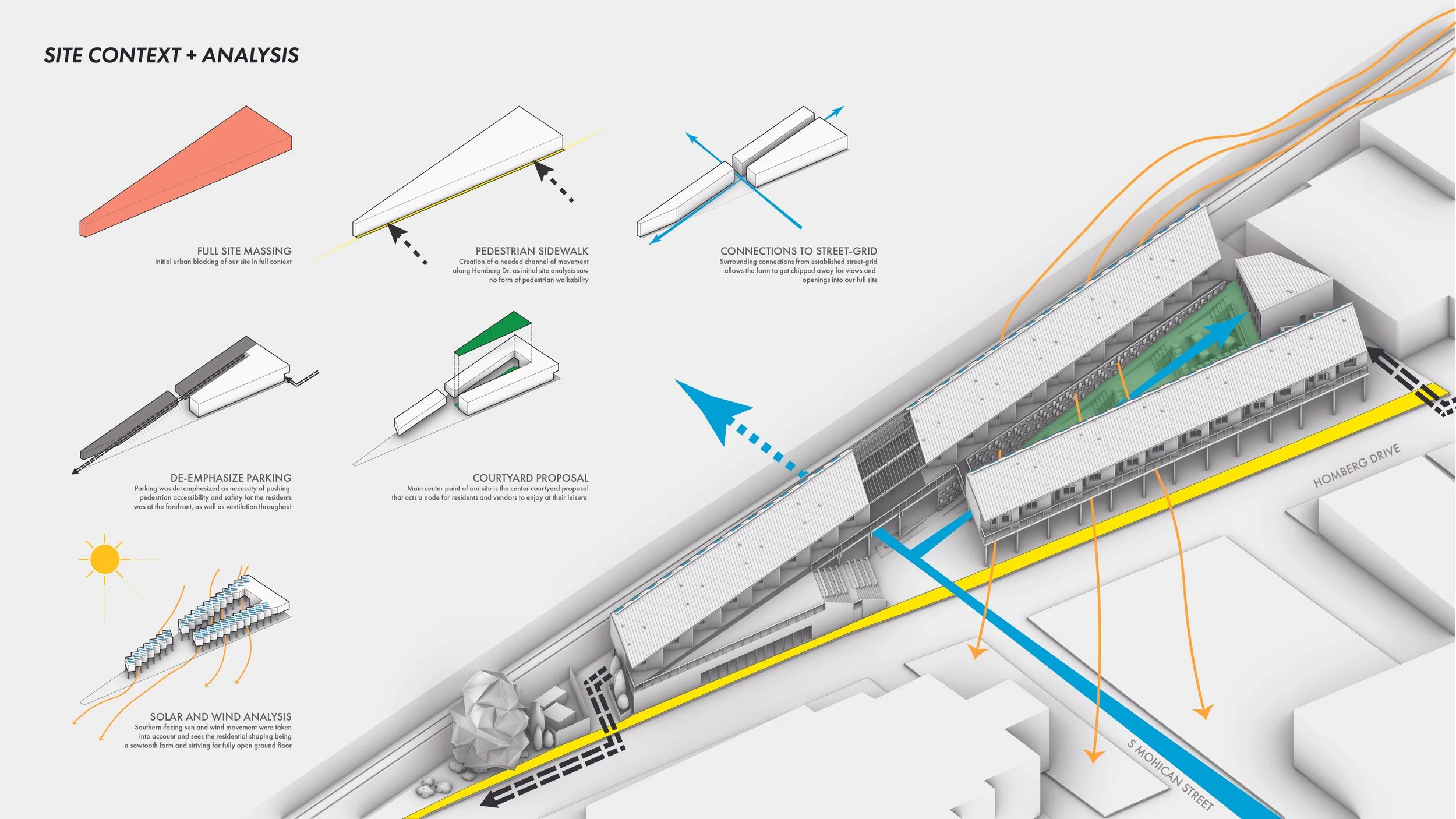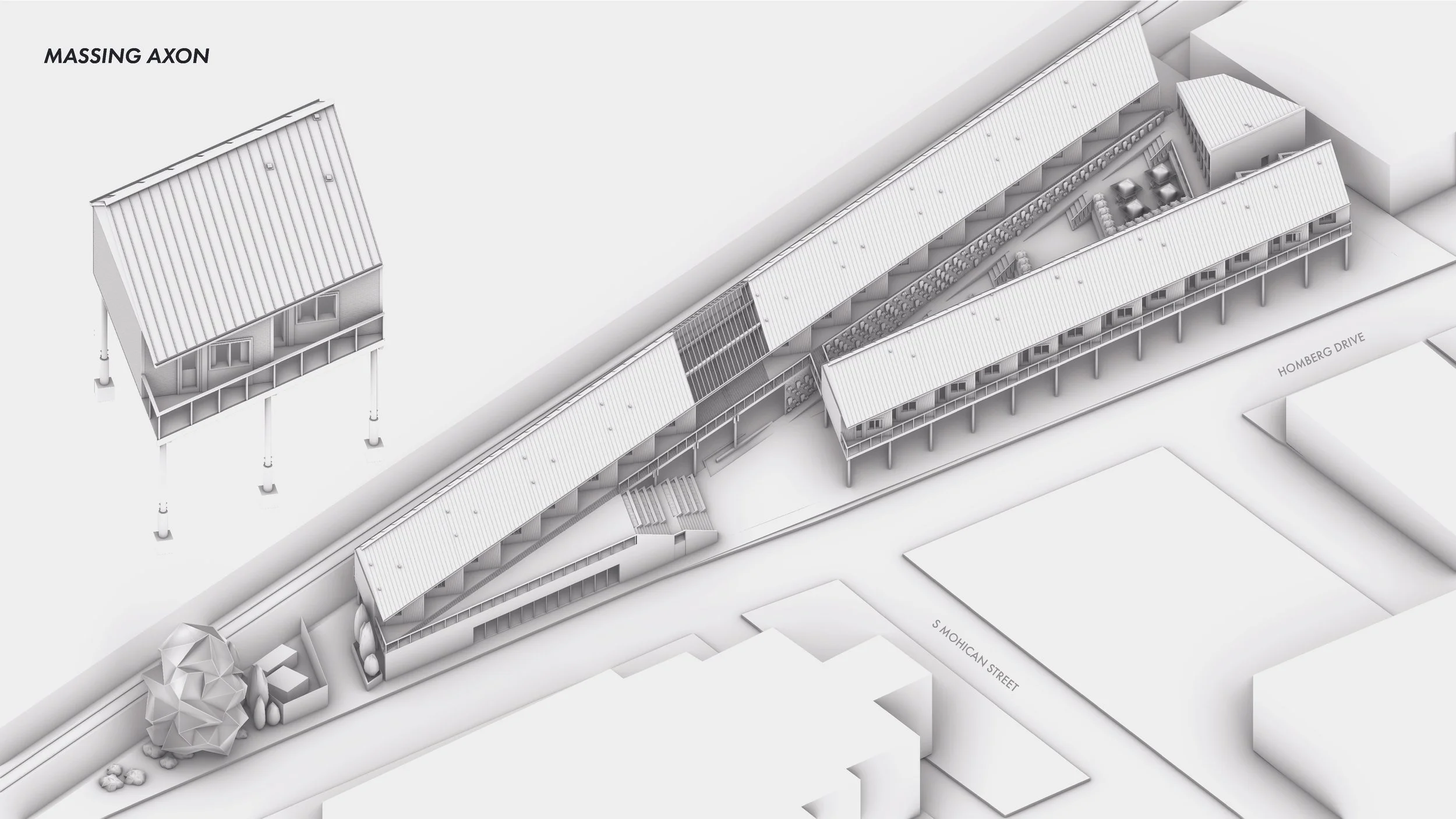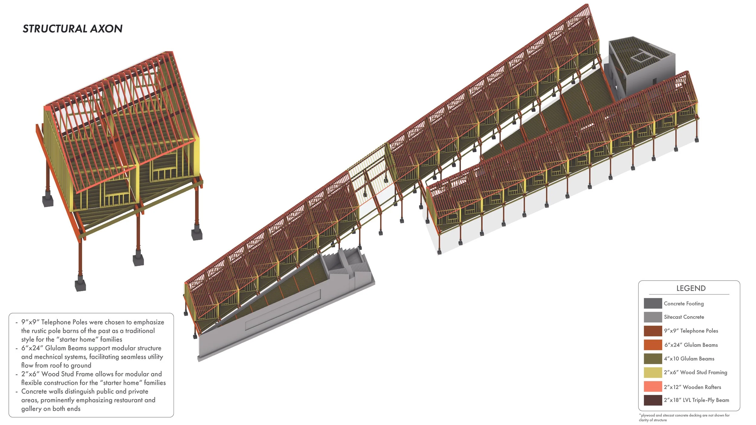Ascension Court reimagines the starter home by integrating living, working, and community spaces into a cohesive residential block at the corner of Homberg Drive and South Mohican Avenue in Knoxville, Tennessee. Responding to the area’s lack of housing and infrastructure, the project centers on a stepped courtyard that defines a public-private realm while fostering connection among residents. Elevated units wrap the courtyard, while the lower levels house Artisan’s Cove—a lively mix of gallery, conference, and market spaces with a restaurant fronting the street and a private alleyway behind. Drawing inspiration from Appalachian architecture, telephone poles replace standard columns, reducing costs while accommodating plumbing and creating open ground-level spaces for parking and commerce. A sawtooth façade maximizes southern light and airflow across the irregular site, while the raised courtyard platform provides circulation and interaction between the street and upper levels. By offering residents opportunities to showcase their work, rent commercial space, and engage with the broader community, Ascension Court blends affordable housing with cultural vitality, shaping an accessible, functional, and distinctly place-based urban form.