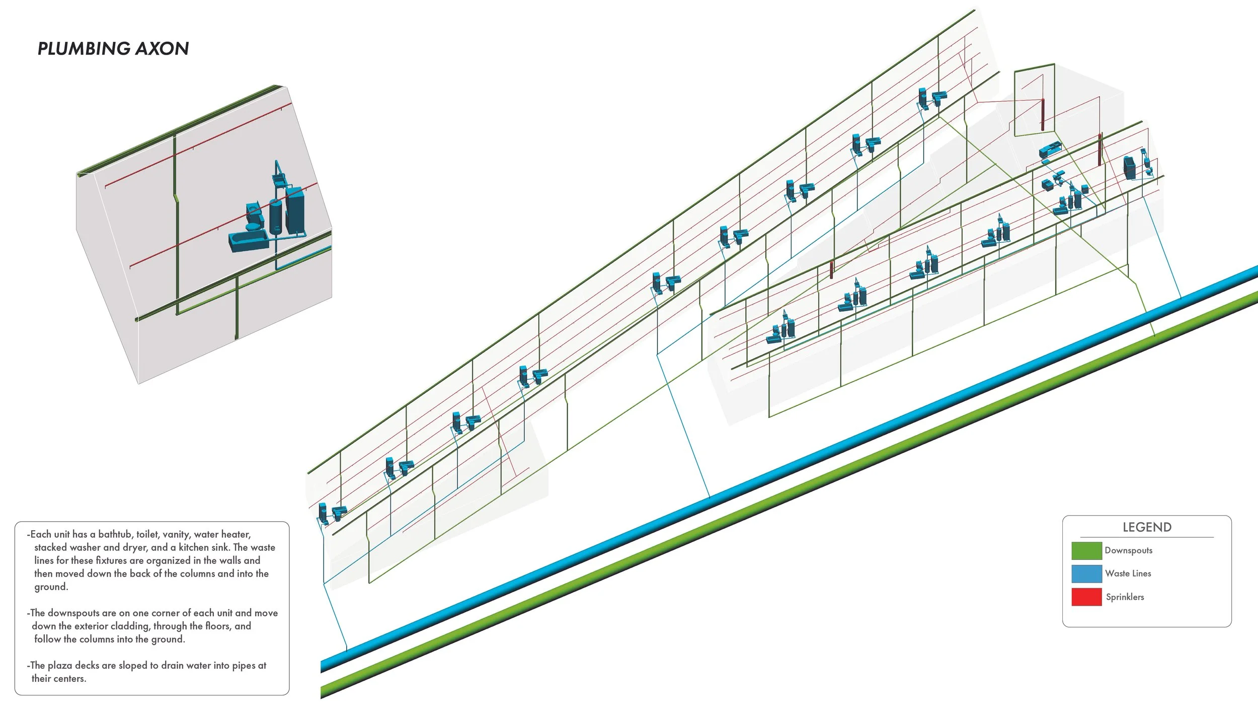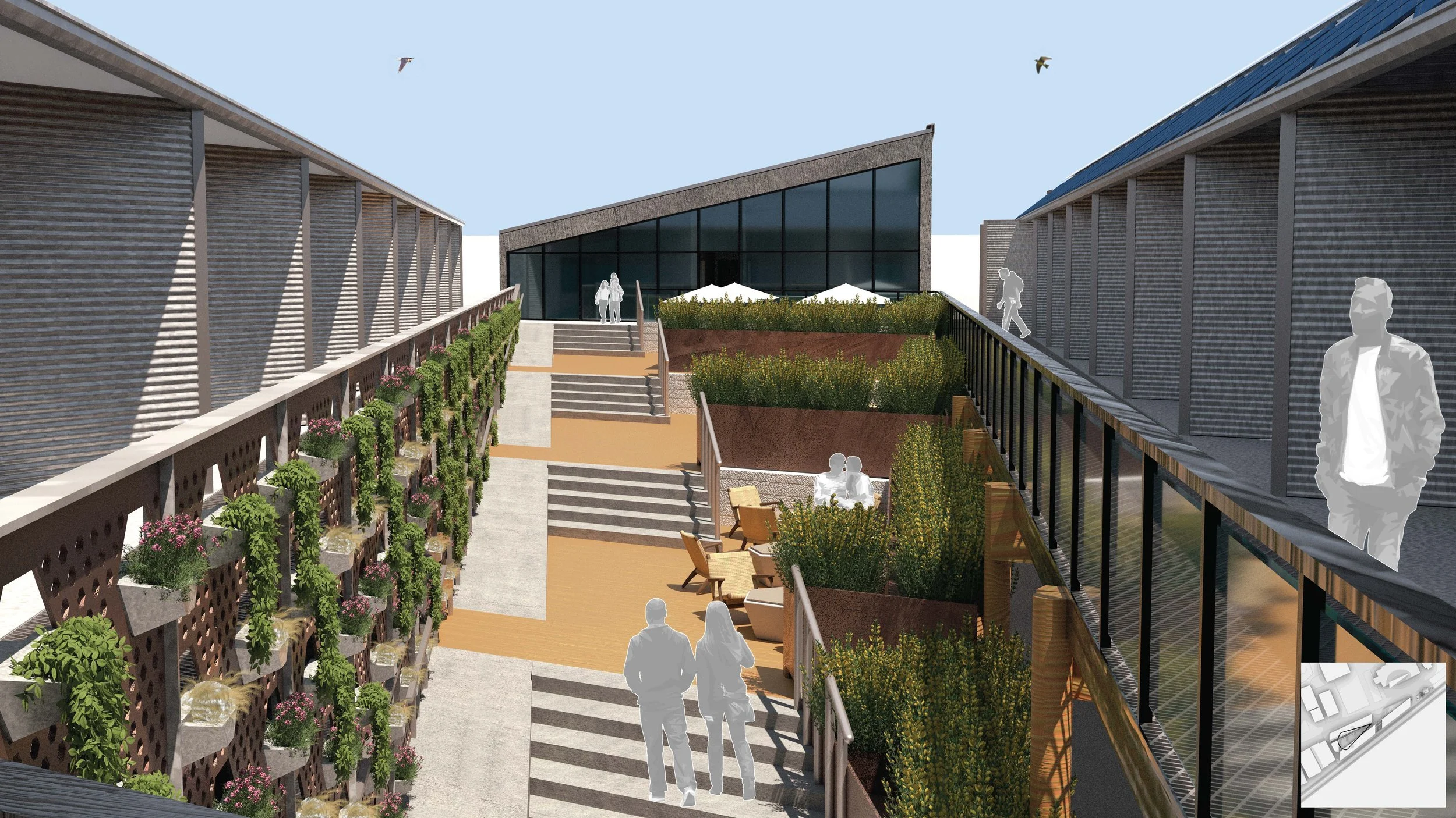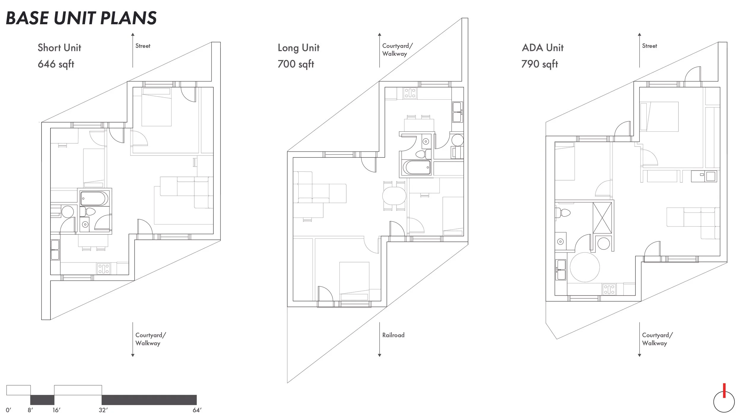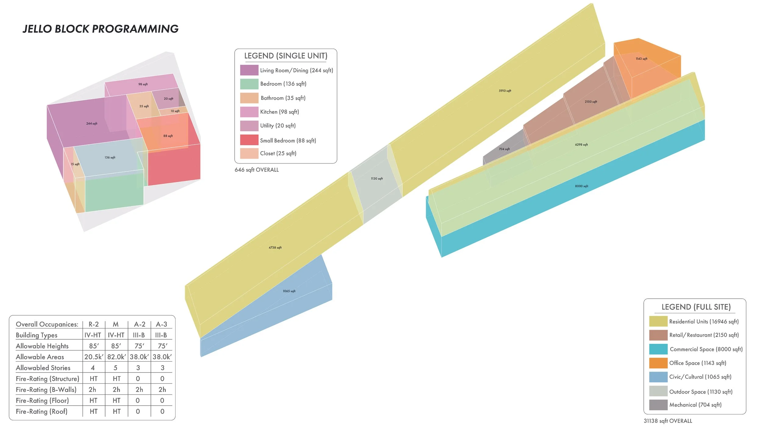 Ascension Court reimagines the starter home by integrating living, working, and community spaces into a cohesive residential block at the corner of Homberg Drive and South Mohican Avenue in Knoxville, Tennessee. Responding to the area’s lack of housing and infrastructure, the project centers on a stepped courtyard that defines a public-private realm while fostering connection among residents. Elevated units wrap the courtyard, while the lower levels house Artisan’s Cove—a lively mix of gallery, conference, and market spaces with a restaurant fronting the street and a private alleyway behind. Drawing inspiration from Appalachian architecture, telephone poles replace standard columns, reducing costs while accommodating plumbing and creating open ground-level spaces for parking and commerce. A sawtooth façade maximizes southern light and airflow across the irregular site, while the raised courtyard platform provides circulation and interaction between the street and upper levels. By offering residents opportunities to showcase their work, rent commercial space, and engage with the broader community, Ascension Court blends affordable housing with cultural vitality, shaping an accessible, functional, and distinctly place-based urban form.