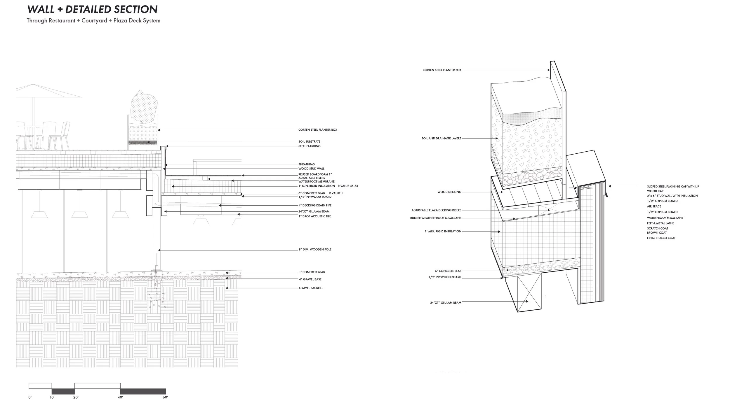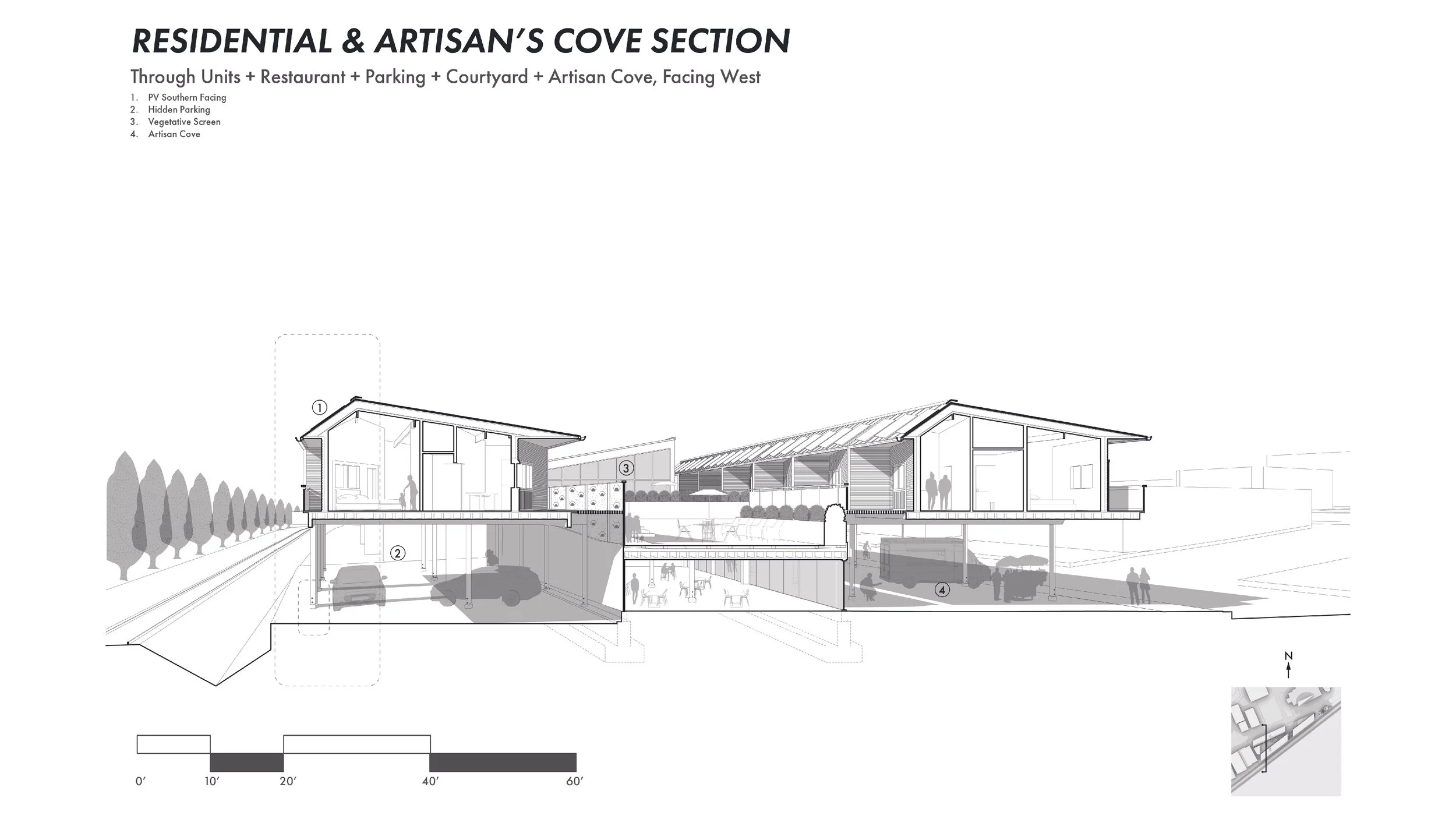 The section above presents a north-to-south cut through the residential units, the discreetly positioned parking at the rear, the central courtyard and restaurant, and Artisan’s Cove fronting the street. As seen, while there is a distinct difference between the lower and upper floors, the courtyard connection allows for anyone to interact with the raised platform at the center, fostering movement and engagement. Residents have the opportunity to rent out space within the commercial area beneath their homes, further encouraging community interaction and providing a platform for showcasing or selling their artwork.