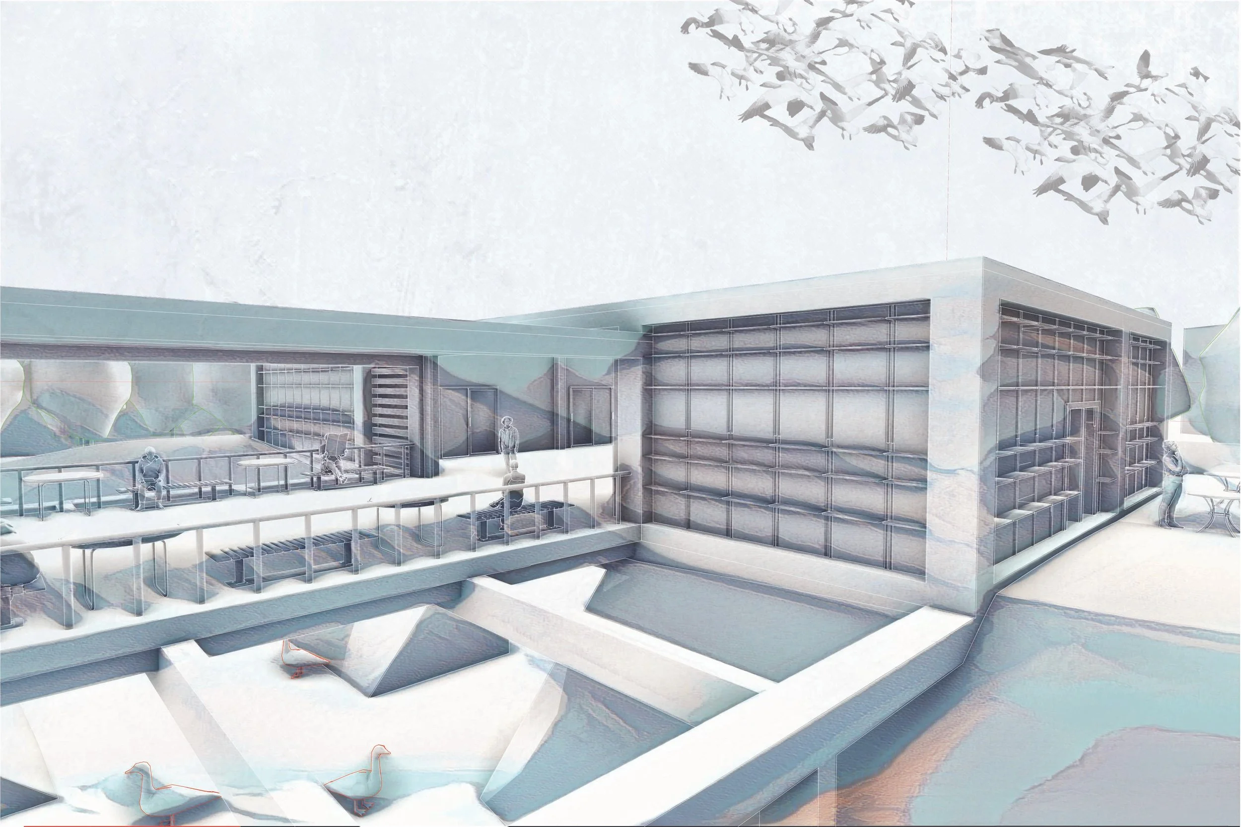 Exploring the intersection of sound, architecture, and media, this design reimagines a streetscape along North Broadway in Knoxville through the lens of the "rage pundit"—a figure who uses anger, influence, and chaos to divide audiences for profit. The structure is organized into three distinct programs and soundscapes: newsrooms, media areas, and the Geese Overstimulation Room (G.O.R.), each offering unique auditory and spatial experiences. Controlled acoustics in the newsrooms contrast with the overwhelming intensity of the G.O.R., while the Nest, inspired by natural bird nests, provides a tranquil retreat with sloped landscapes and piping that produces calming white noise. Organic forms within the Nest counterbalance the rigid geometry of the media spaces, and transparent materials, strategic lighting, and dynamic forms emphasize sensory engagement across the site. By integrating sound, form, and spatial interaction, the project demonstrates how architecture can shape perception, provoke reflection, and create immersive environments that balance chaos, absurdity, and tranquility.